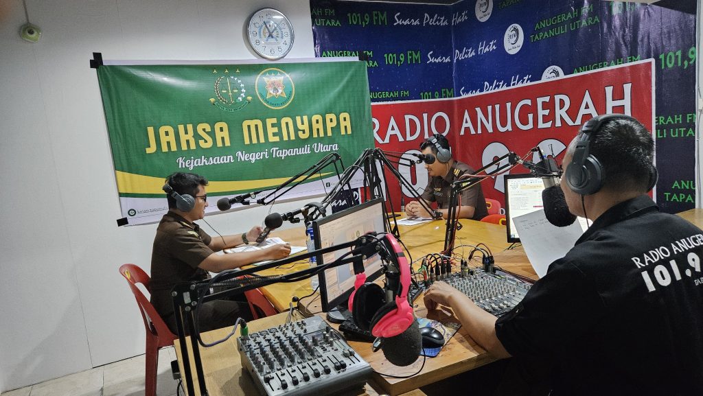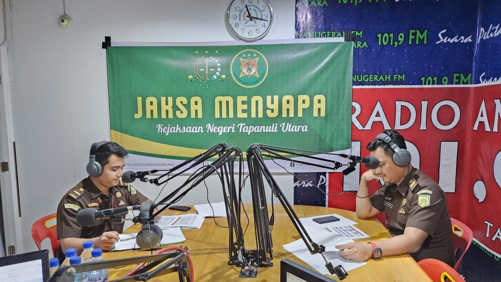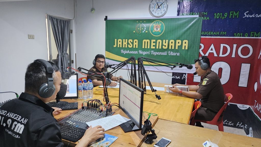 Rabu, 17 Januari 2024, Telah dilaksanakan Kegiatan Jaksa Menyapa di radio Anugerah FM 101.9 MHz wilayah kabupaten Tapanuli Utara dengan Tema Peran Kejaksaan pada Pemilu 2024 serta potensi pelanggaran dan kecurangan dalam pelaksanaan Pemilu 2024, HoteL GLoRy, Jl. DI Panjaitan 51, Tapanuli Utara, Sumatera Utara 22411, Indonesia, Tim Intelijen Kejaksaan Negeri Tapanuli Utara , karena kegiatan tersebut dapat memberikan pengetahuan kepada pendengar setia Radio dalam pelaksanaan Pemilu Tahun 2024, Kegiatan tersebut dilaksanakan dengan aman dan kondusif.